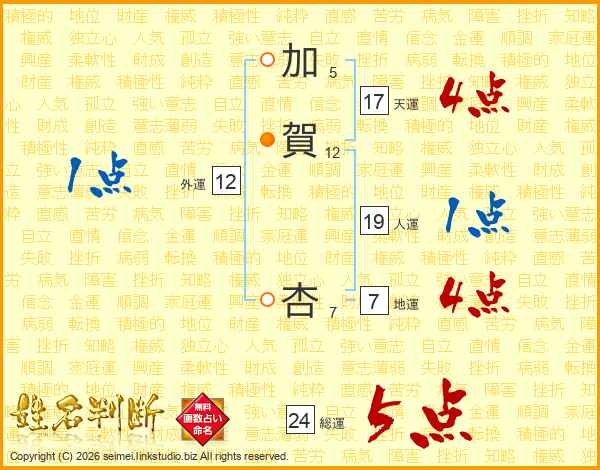加(5画)賀(12画)  杏(7画)