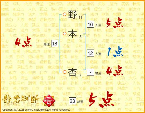 野本杏さんの総運は23画の5点!