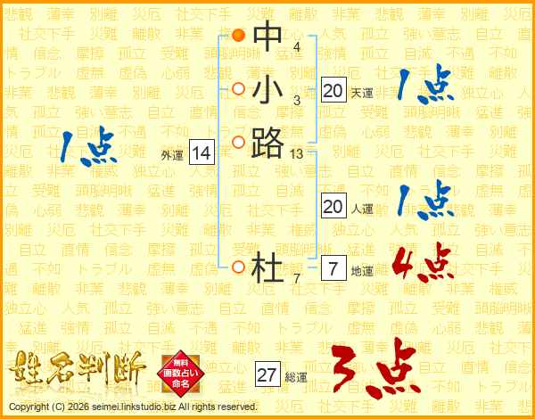 生活面を象徴する運勢です。外部から受ける影響力を表し、結婚運、家庭運や職場、環境への順応性を表します。総運から人運を引いた画数。姓や名が1文字の場合を除く。
