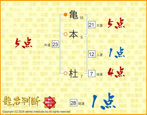 亀本杜さんの天運は21画の5点!