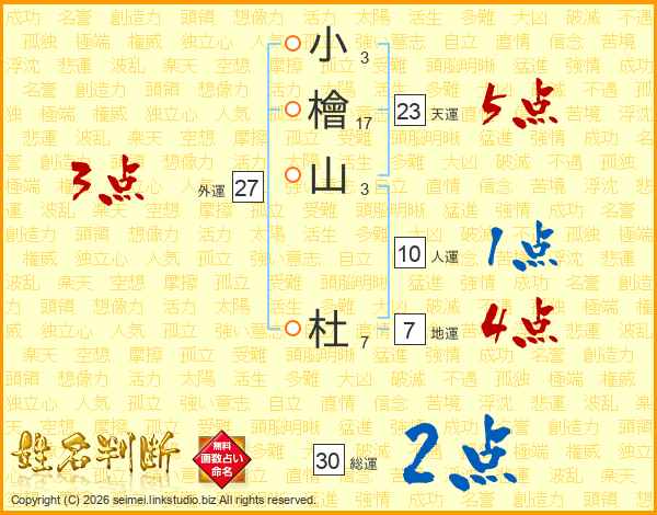 生活面を象徴する運勢です。外部から受ける影響力を表し、結婚運、家庭運や職場、環境への順応性を表します。総運から人運を引いた画数。姓や名が1文字の場合を除く。