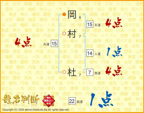 生活面を象徴する運勢です。外部から受ける影響力を表し、結婚運、家庭運や職場、環境への順応性を表します。総運から人運を引いた画数。姓や名が1文字の場合を除く。