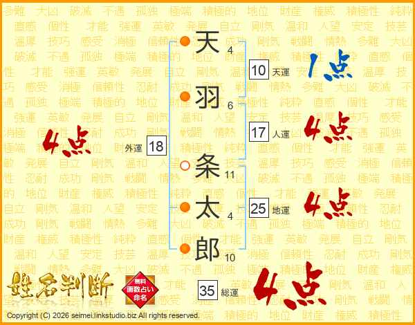 天(4画)羽(6画) 条(11画)太(4画)郎(10画)