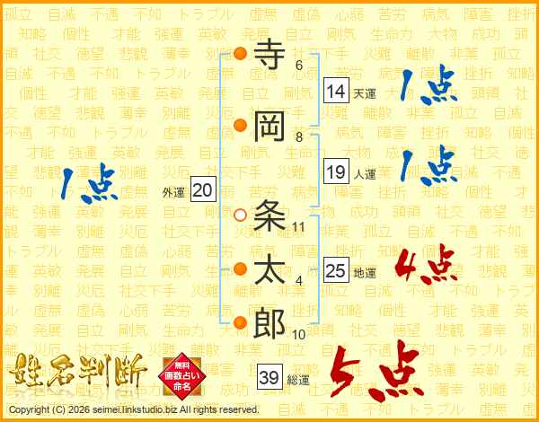 寺(6画)岡(8画) 条(11画)太(4画)郎(10画)