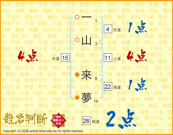 生活面を象徴する運勢です。外部から受ける影響力を表し、結婚運、家庭運や職場、環境への順応性を表します。総運から人運を引いた画数。姓や名が1文字の場合を除く。