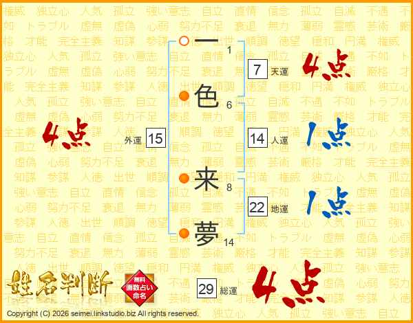 生活面を象徴する運勢です。外部から受ける影響力を表し、結婚運、家庭運や職場、環境への順応性を表します。総運から人運を引いた画数。姓や名が1文字の場合を除く。