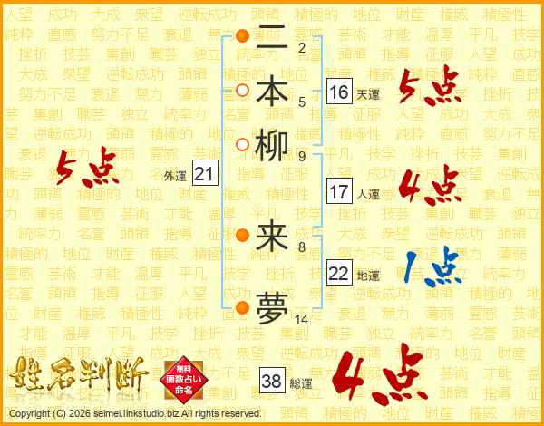 二本柳来夢さんの総運は38画の4点!