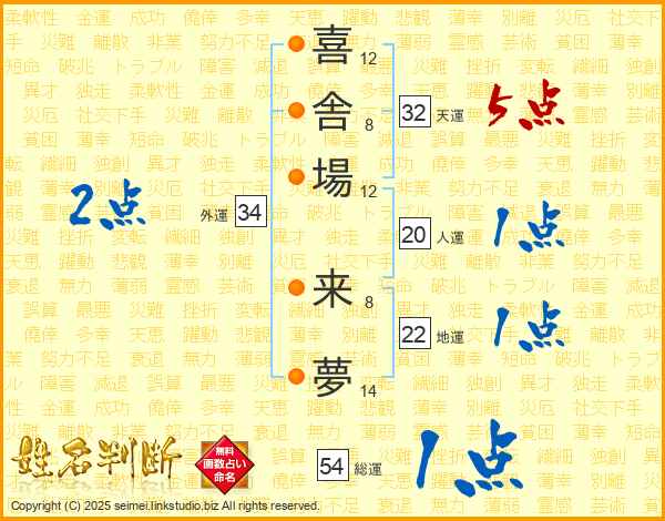 喜(12画)舎(8画)場(12画) 来(8画)夢(14画)