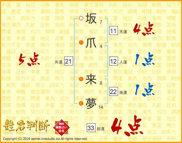坂爪来夢さんの総運は33画の4点!
