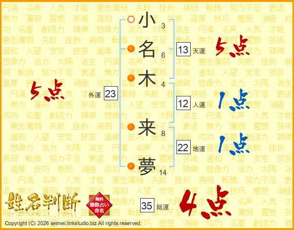 小(3画)名(6画)木(4画) 来(8画)夢(14画)