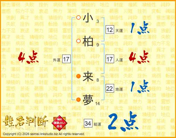 生活面を象徴する運勢です。外部から受ける影響力を表し、結婚運、家庭運や職場、環境への順応性を表します。総運から人運を引いた画数。姓や名が1文字の場合を除く。