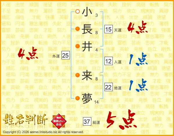 小(3画)長(8画)井(4画) 来(8画)夢(14画)
