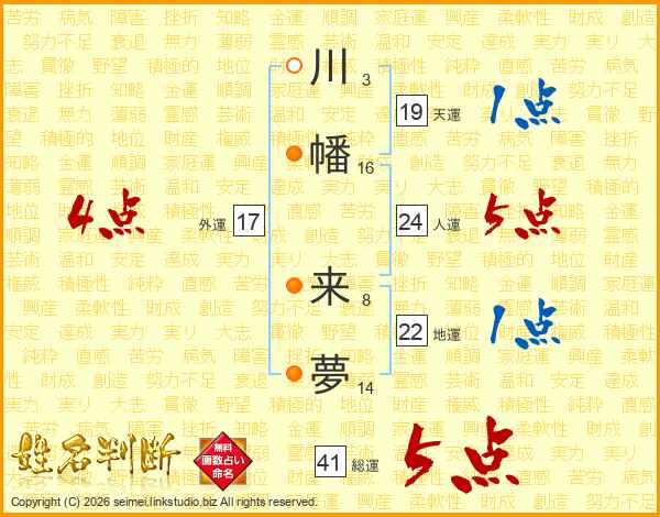 生活面を象徴する運勢です。外部から受ける影響力を表し、結婚運、家庭運や職場、環境への順応性を表します。総運から人運を引いた画数。姓や名が1文字の場合を除く。