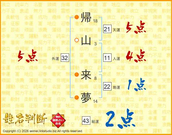 帰山来夢さんの外運は32画の5点!