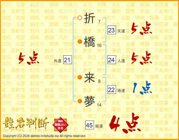 あなたの人生を表す1番重要な運勢です。生涯を通じて影響する総合運となり、主に50歳以降の晩年期に影響を及ぼします。苗字と名前の合計画数。