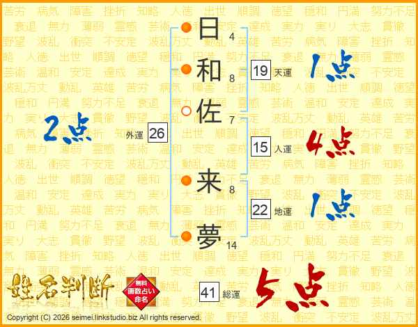 日(4画)和(8画)佐(7画) 来(8画)夢(14画)