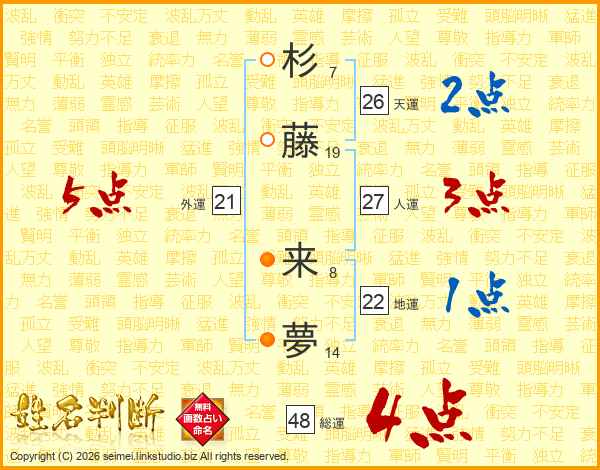 杉(7画)藤(19画) 来(8画)夢(14画)