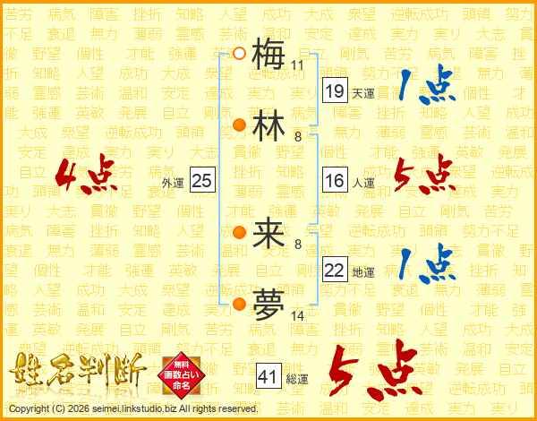あなたの人生を表す1番重要な運勢です。生涯を通じて影響する総合運となり、主に50歳以降の晩年期に影響を及ぼします。苗字と名前の合計画数。
