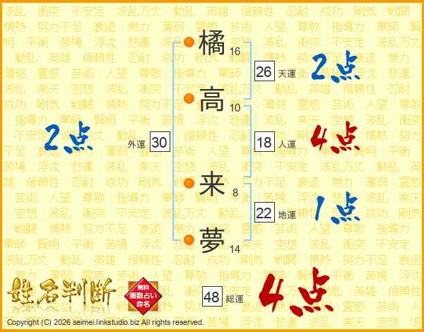 あなたの人生を表す1番重要な運勢です。生涯を通じて影響する総合運となり、主に50歳以降の晩年期に影響を及ぼします。苗字と名前の合計画数。