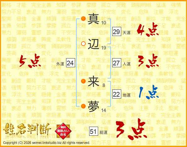 生活面を象徴する運勢です。外部から受ける影響力を表し、結婚運、家庭運や職場、環境への順応性を表します。総運から人運を引いた画数。姓や名が1文字の場合を除く。
