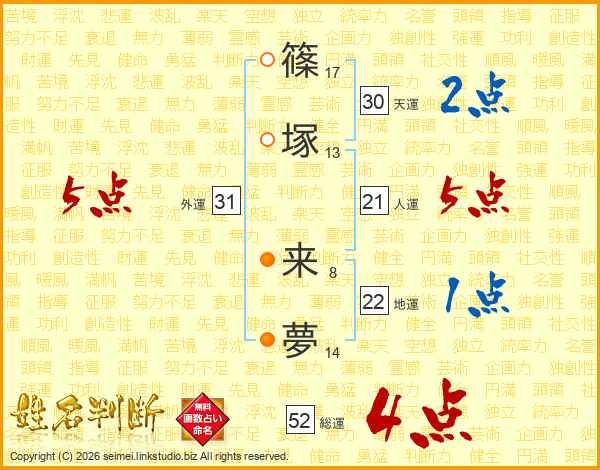 篠(17画)塚(13画) 来(8画)夢(14画)