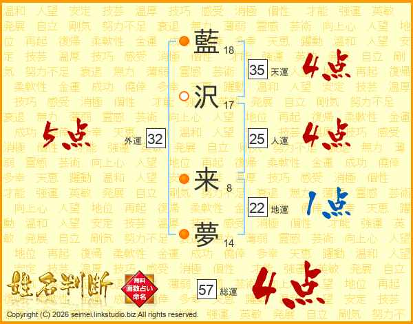 藍(18画)沢(17画) 来(8画)夢(14画)