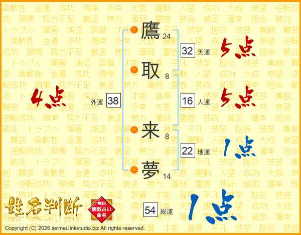 鷹(24画)取(8画) 来(8画)夢(14画)