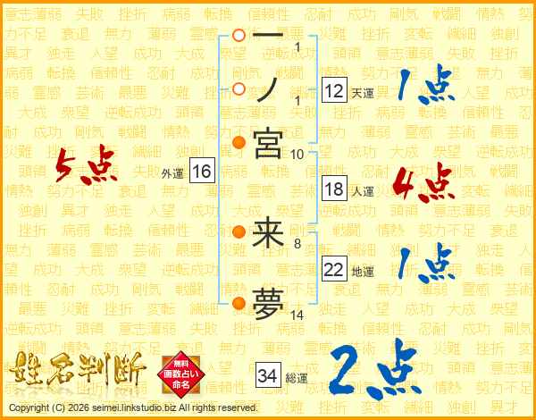 一(1画)ノ(1画)宮(10画) 来(8画)夢(14画)