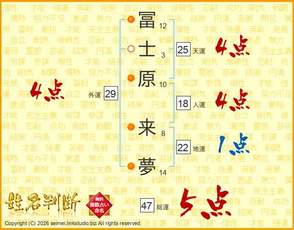 冨(12画)士(3画)原(10画) 来(8画)夢(14画)