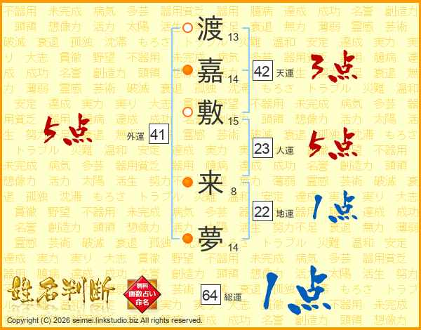 渡(13画)嘉(14画)敷(15画) 来(8画)夢(14画)