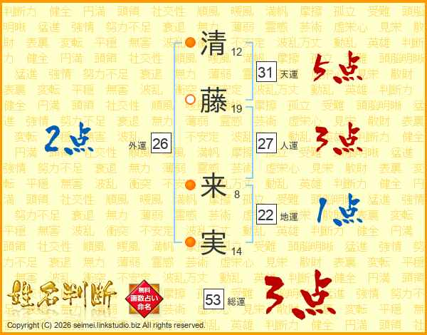 清(12画)藤(19画) 来(8画)実(14画)