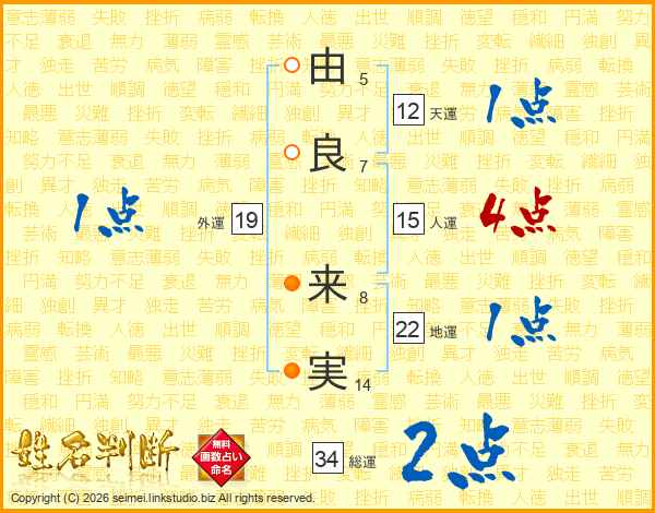 由(5画)良(7画) 来(8画)実(14画)