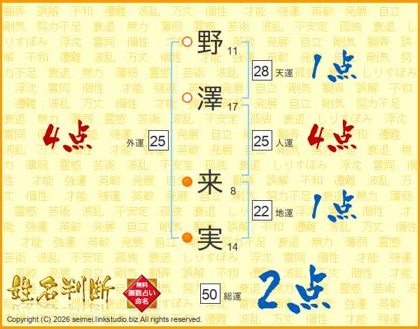 野(11画)澤(17画) 来(8画)実(14画)