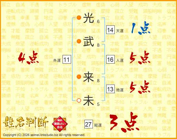 光(6画)武(8画) 来(8画)未(5画)