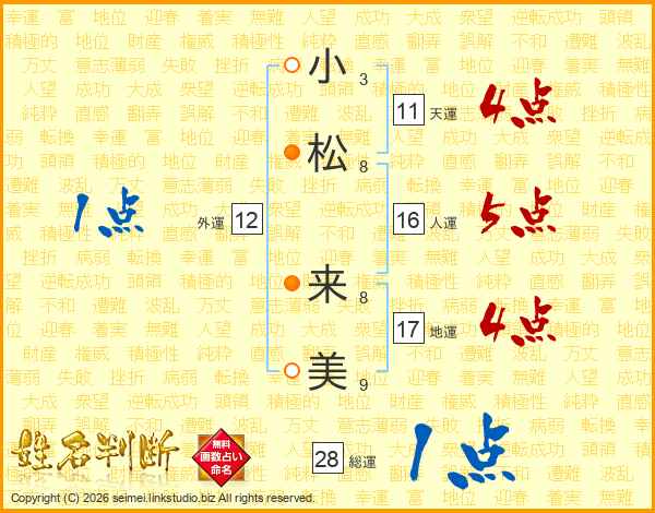 小(3画)松(8画) 来(8画)美(9画)