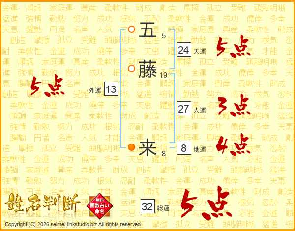 五藤来さんの総運は32画の5点!