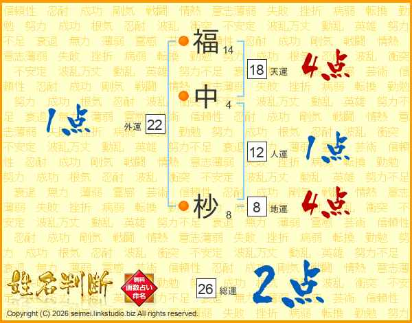 生活面を象徴する運勢です。外部から受ける影響力を表し、結婚運、家庭運や職場、環境への順応性を表します。総運から人運を引いた画数。姓や名が1文字の場合を除く。