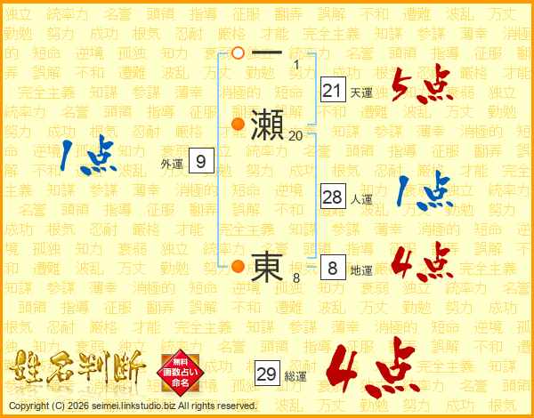 あなたの人生を表す1番重要な運勢です。生涯を通じて影響する総合運となり、主に50歳以降の晩年期に影響を及ぼします。苗字と名前の合計画数。