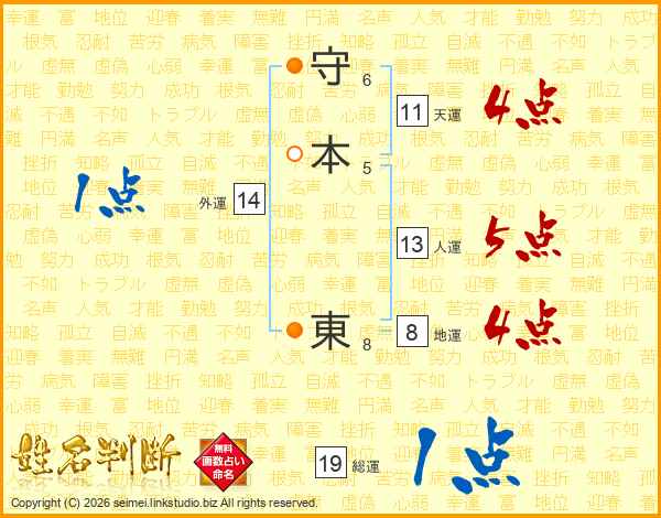 生活面を象徴する運勢です。外部から受ける影響力を表し、結婚運、家庭運や職場、環境への順応性を表します。総運から人運を引いた画数。姓や名が1文字の場合を除く。