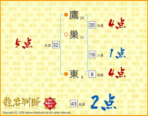 鷹巣東さんの総運は43画の2点!