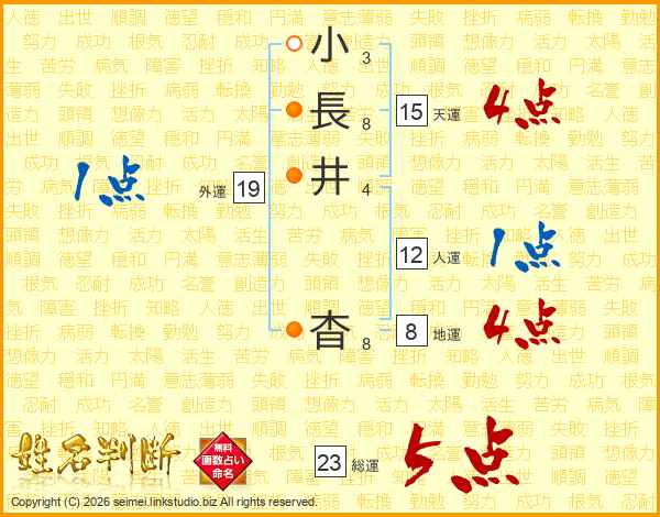 生活面を象徴する運勢です。外部から受ける影響力を表し、結婚運、家庭運や職場、環境への順応性を表します。総運から人運を引いた画数。姓や名が1文字の場合を除く。