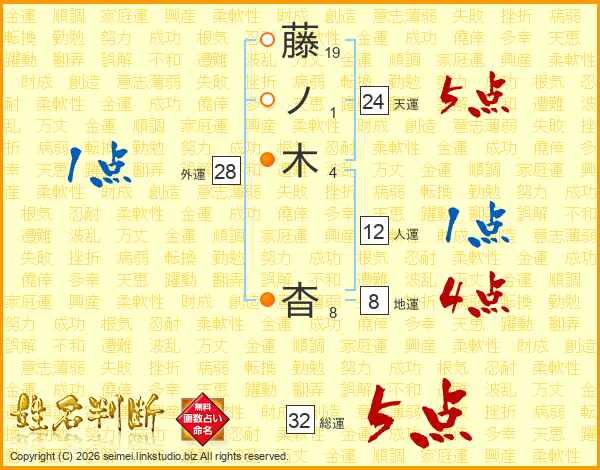 藤ノ木杳さんの総運は32画の5点!