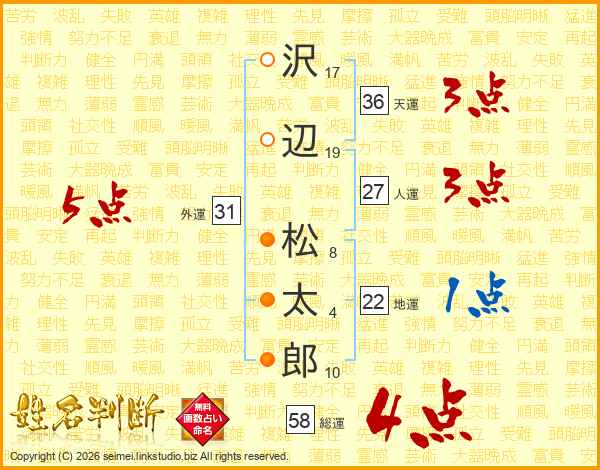 沢辺松太郎さんの総運は58画の4点!