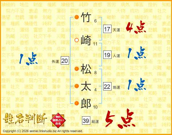 竹(6画)崎(11画) 松(8画)太(4画)郎(10画)