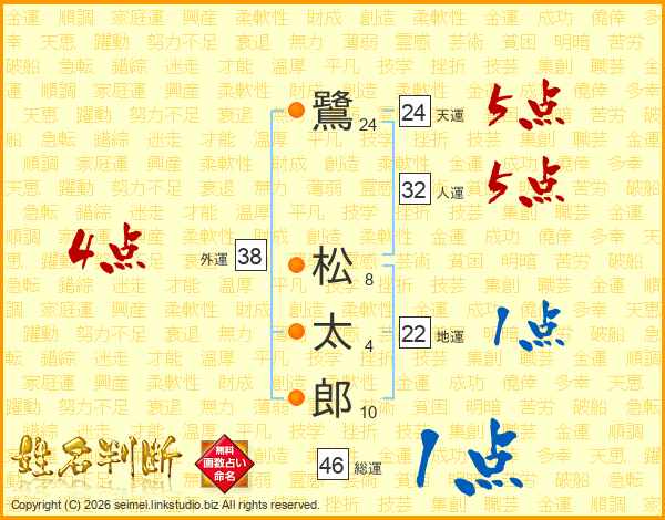 鷺(24画) 松(8画)太(4画)郎(10画)