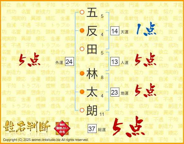 五(5画)反(4画)田(5画) 林(8画)太(4画)朗(11画)