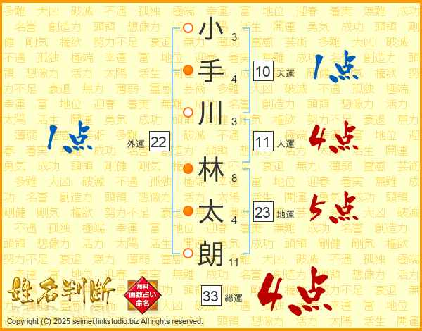 小(3画)手(4画)川(3画) 林(8画)太(4画)朗(11画)