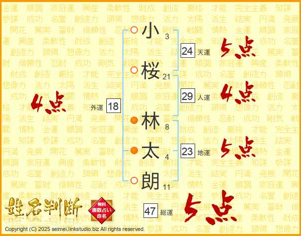 小(3画)桜(21画) 林(8画)太(4画)朗(11画)