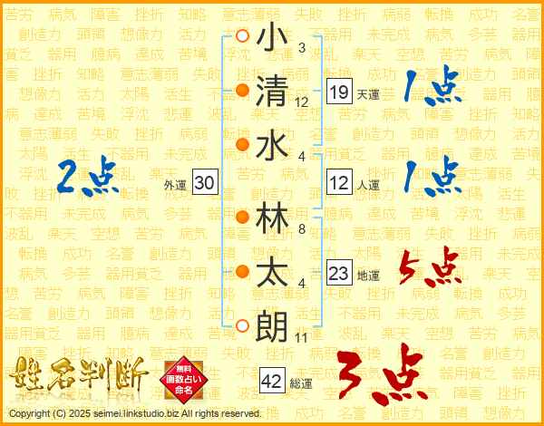 小(3画)清(12画)水(4画) 林(8画)太(4画)朗(11画)