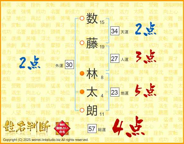 数(15画)藤(19画) 林(8画)太(4画)朗(11画)